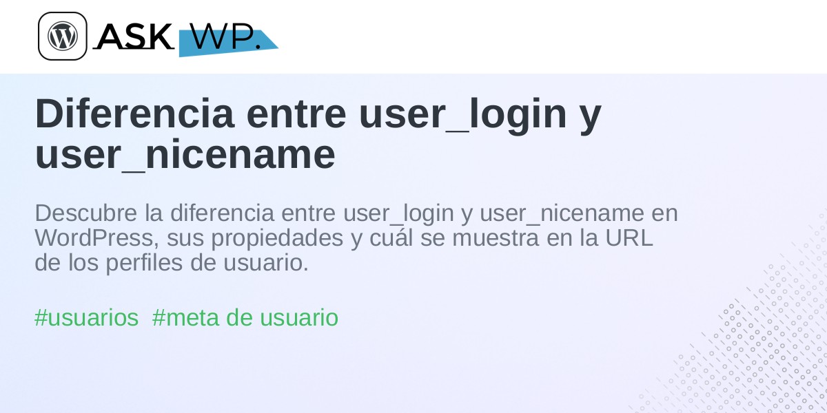 Cuando llamas a la función get_users(), se devuelve una lista de objetos de usuario. Cada uno de esos usuarios tiene varias propiedades. ¿Cuál es la diferencia entre user_login y user_nicename en esas propiedades devueltas para cada usuario? ¿Y cuál de estas dos propiedades se muestra en la URL? (¡Pregunto porque ambas propiedades son iguales en mi caso!).