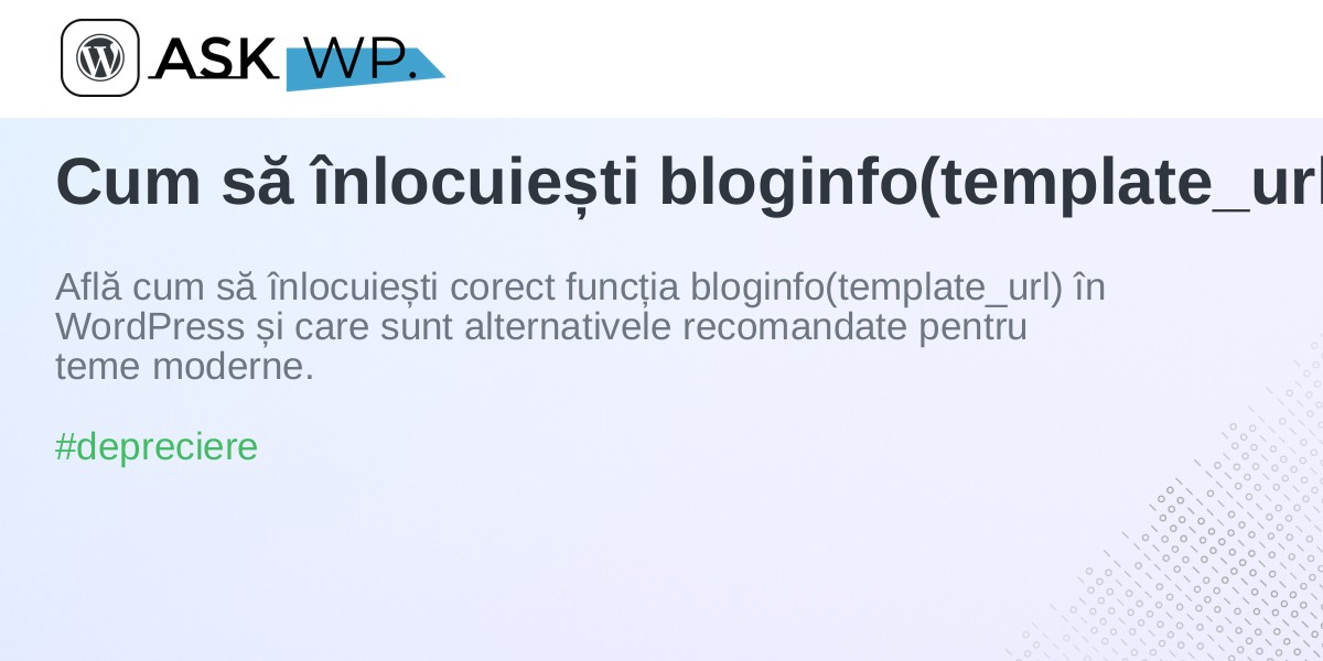 Practic, am folosit bloginfo(template_url) într-o temă WordPress, dar când rulez theme-checker, acesta recomandă înlocuirea bloginfo(template_url) cu get_template_directory_uri(), însă când folosesc get_template_directory_uri() nu funcționează. Funcționează bine dacă îl folosesc pentru a înlocui get_bloginfo(template_url) dar nu asta vreau acum. Este bloginfo(template_url) depreciat? Dacă da, care este înlocuitorul său?