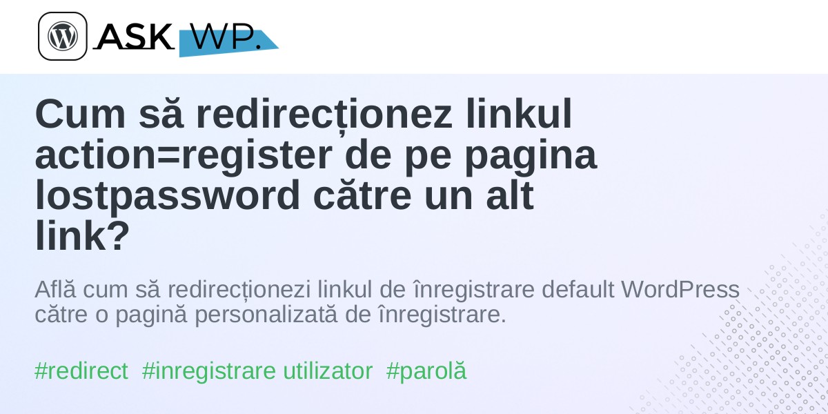 Am o pagină specifică de înregistrare WordPress unde utilizatorii noi completează un formular special. Totuși, dacă cineva dă click pe linkul "ai uitat parola" din secțiunea de login a site-ului meu și apoi pe "înregistrare", acesta va putea să se înregistreze fără să treacă prin formularul normal. Cum pot redirecționa pagina wp-login.php?action=register către sample.com/register?