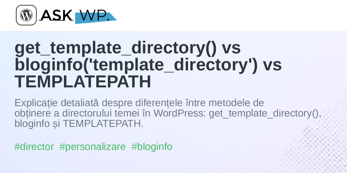 Pentru obținerea locației temei: Dacă folosești TEMPLATEPATH sau bloginfo( 'template_directory'). Oprește-te! Ar trebui să folosești utilul get_template_directory() așa cum se vede în exemplele mele de mai sus.