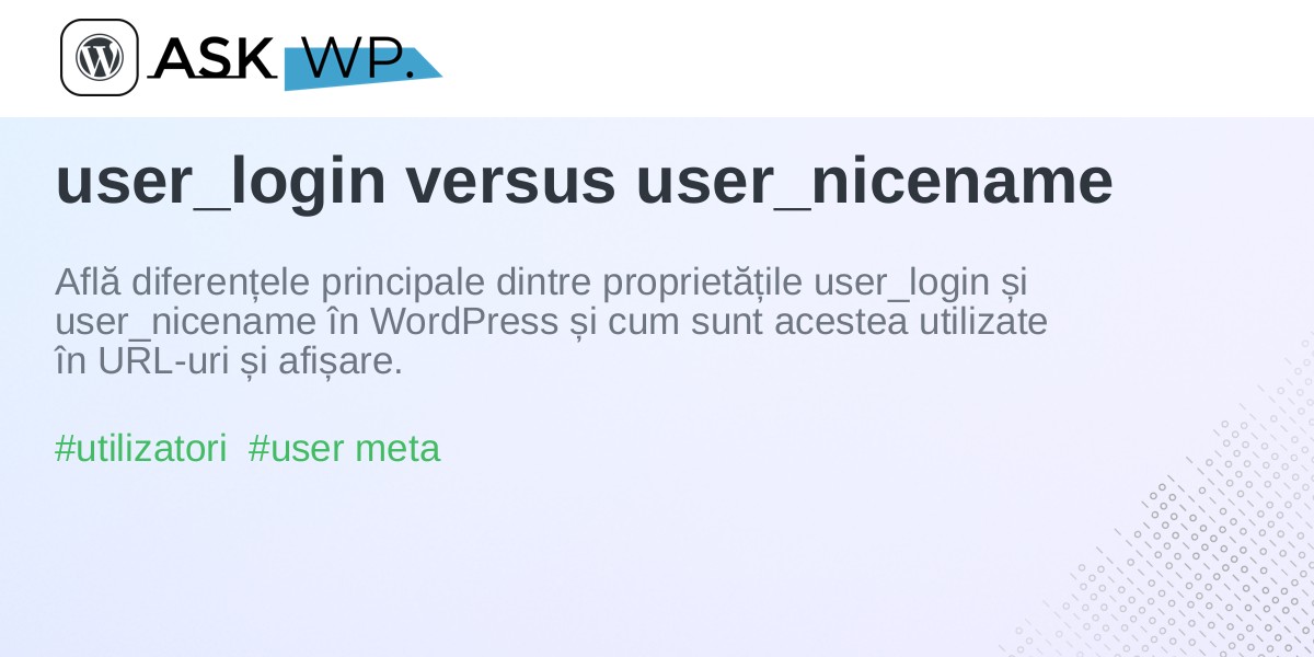 Când apelezi funcția get_users(), se returnează o listă de obiecte utilizator. Fiecare dintre acești utilizatori are mai multe proprietăți. Care este diferența dintre user_login și user_nicename în aceste proprietăți returnate pentru fiecare utilizator? Și care dintre aceste două proprietăți sunt afișate în URL? (Întreb pentru că ambele proprietăți sunt identice în cazul meu!).